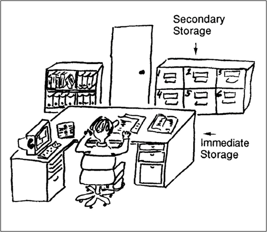 He used the example of an office worker as shown in Figure 1. Information is available in the notepad on the desk, through the computer terminal, in the papers piled or carefully organized on the desktop, through other people using the telephone, from books in the bookcase, and papers in the filing cabinet. The media take different forms—from paper documents to machines to people—but each piece of information has a cost associated with finding and accessing it. Looked at abstractly, the office, at any moment, is characterized by a cost structure over the information in it. What is usually meant by an organized office is one with a cost structure arranged to lower the cost of information-based work processes performed within it. File cabinets, desks, filing systems, and computer-based information retrieval systems can be thought of abstractly as just means for changing the cost structure of information.