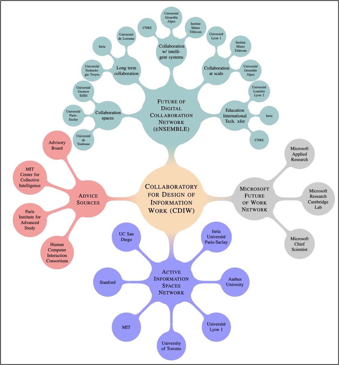 Note. CDIW connects the original Active Information Spaces network to the eNSEMBLE Future of Digital Collaboration, spanning 80 research groups and 30+ universities in France, and the Microsoft Future of Work network that is distributed across research labs in the U.S. and Europe.