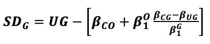 Intuitively, equation (9) allows us to assess whether participants are more cooperative toward an ingroup member whose contribution matches what they expect from an outgroup. In essence, it isolates whether group identity alone affects behavior when expectations are held constant. Additionally, a complementary and mathematically equivalent approach (see Annex 1 for formal proof) is to evaluate whether participants behave less cooperatively with an outgroup member whose contribution aligns with their expectations for the ingroup. Both formulations capture the same behavioral asymmetry—namely, the differential treatment of identical contributions depending solely on the social identity of the partner—which lies at the core of statistical discrimination. SD_G in equation (10) assesses whether expectations towards the ingroup affect individuals' behavior.