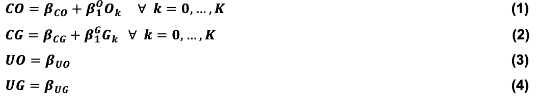Let CG and CO represent the conditional cooperation functions towards the ingroup and the outgroup, respectively, and in the same line, UG and UO the unconditional cooperation functions. UO and UG are constant parameters that represent the part of the contribution that is not contingent on the partner allocation to the group account, but it is inheritably determined by their willingness to cooperate. In contrast, β_1^G^ GK and β_1^O^ OK represent the slope parameters of the conditional cooperation functions i.e. the best response to any of the partner contributions. Notice that, due to their unconditionality, UG and UO are flat in our Cartesian representation, meaning that they remain constant to all possible partner allocations.