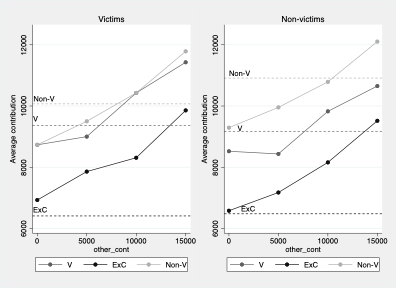 Given that we only have seven observations from ex-combatants, the results section focuses on the cooperative behavior of victims and non-victims. Figure 2 replicates the structure of Figure 1 but displays average contribution decisions by group type, rather than individual-level data. As such, the intersection points in Figure 2 do not correspond precisely to participants' implicit beliefs, but rather illustrate aggregate trends.