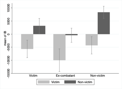 Note: Figure 3 illustrates the averages and standard deviations of the estimated implicit beliefs regarding the behavior of victims, ex-combatants, and non-victims. The light gray bars represent victims, while the dark gray bars represent non-victims.