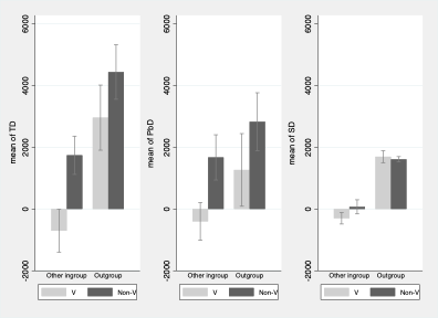 Note: from left to right, Figure 4 illustrates the averages and standard deviations of the total discrimination (TD), preference-based discrimination (Pbd), and statistical discrimination (SD) against the other ingroup and the outgroup. The light gray bars represent victims, while the dark gray bars represent non-victims.