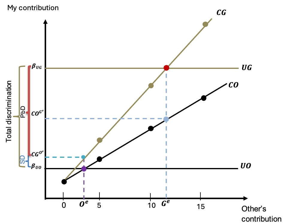 - We obtain Ge and Oe which are the subjects' implicit beliefs about an ingroup and an outgroup partner's behavior, respectively. Geometrically, these are the intersection points between the subject's unconditional cooperation (UC) level and their conditional cooperation (CC) strategy. From a behavioral perspective, Ge and Oe reflect the contributions that participants implicitly anticipate from each group, absent direct information.