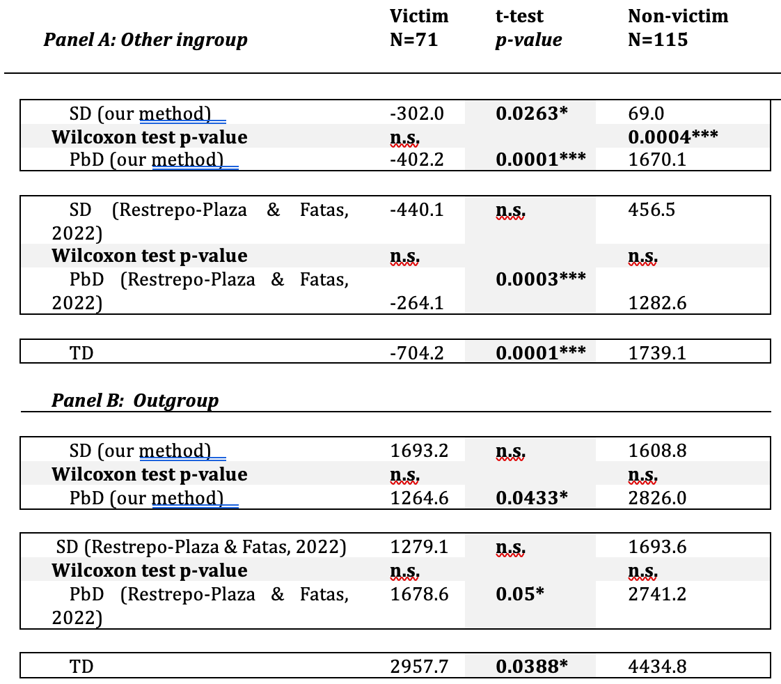 Note: table 1 displays the averages of the total discrimination (TD), preference-based discrimination (Pbd), and statistical discrimination (SD) from victims and non-victims against the other ingroup (panel A) and the outgroup (panel B) from. We use the t-test for comparisons between victims' and non-victims' behavior, and the Wilcoxon paired test to compare SD and PbD values within the same group.