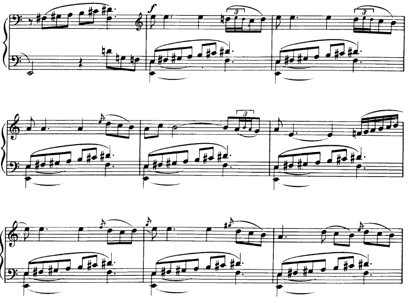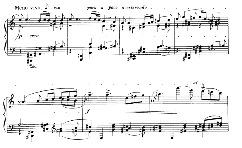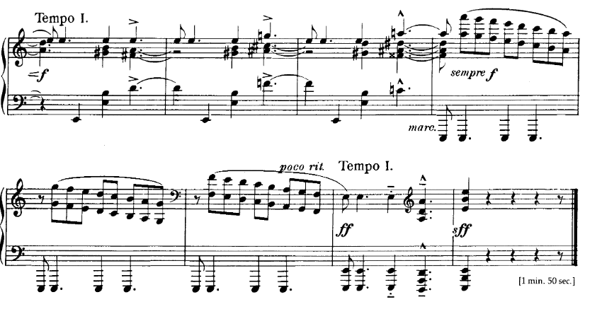 This motive element will unfold throughout the piece, transposed, and divided into smaller fragments, creating a cohesion that will permeate various dance forms, from those that make the piano an eminently percussive instrument, as we see in these first four bars, to those that recover ballroom dance accompaniment modes. The unity is formed by the continuously unfolding motive cell.