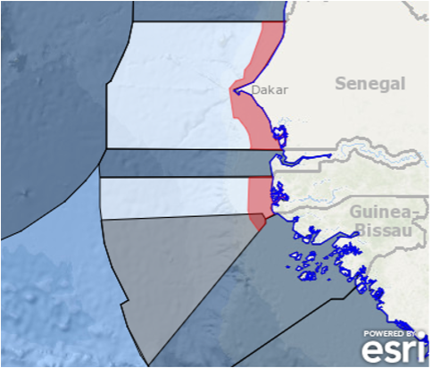 Figure 1: The Exclusive Economic Zone (EEZ) of Senegal (150,000 km2), with the zone in grey jointly managed by Senegal and Guinea-Bissau. The inshore fishing area (red) extends to 50 km or 200 m depth, whichever comes first. Light blue represents the high seas, while dark blue represents the EEZs of other countries.