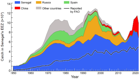As bad as it is, this is not the most problematic aspect of China’s fisheries policy in NW Africa. Rather, it is the opening of a multitude of fishmeal (and fish oil) plants in that region (Shea et al., 2025), which divert sardinella and other small pelagic fishes such as bonga (Ethmalosa fimbriata) from direct human consumption, and export the fishmeal and fish oil to support aquaculture in China, which now consumes 60% of their world production (Pauly et al., 2022), with Norway and its salmon consuming much of the rest. The result of this, combined with the general scarcity of fish, is that thousands of women previously engaged in the sun drying or smoking of fish for transport to the protein-deficient interior of the country have ceased to have fish to process and the average annual fish consumption in Senegal has declined from 29 kg per person in 2008 to 14 kg in 2022 (Bara & Pierre, 2024).
