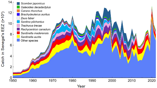 Our analysis of Senegal's marine fisheries catches began in 1950, when the Food and Agriculture Organization of the United Nations (FAO) initiated the publication of annual marine catch statistics covering the entire world, including the “Afrique-Occidentale française”, which comprised eight now-independent countries, including Senegal.