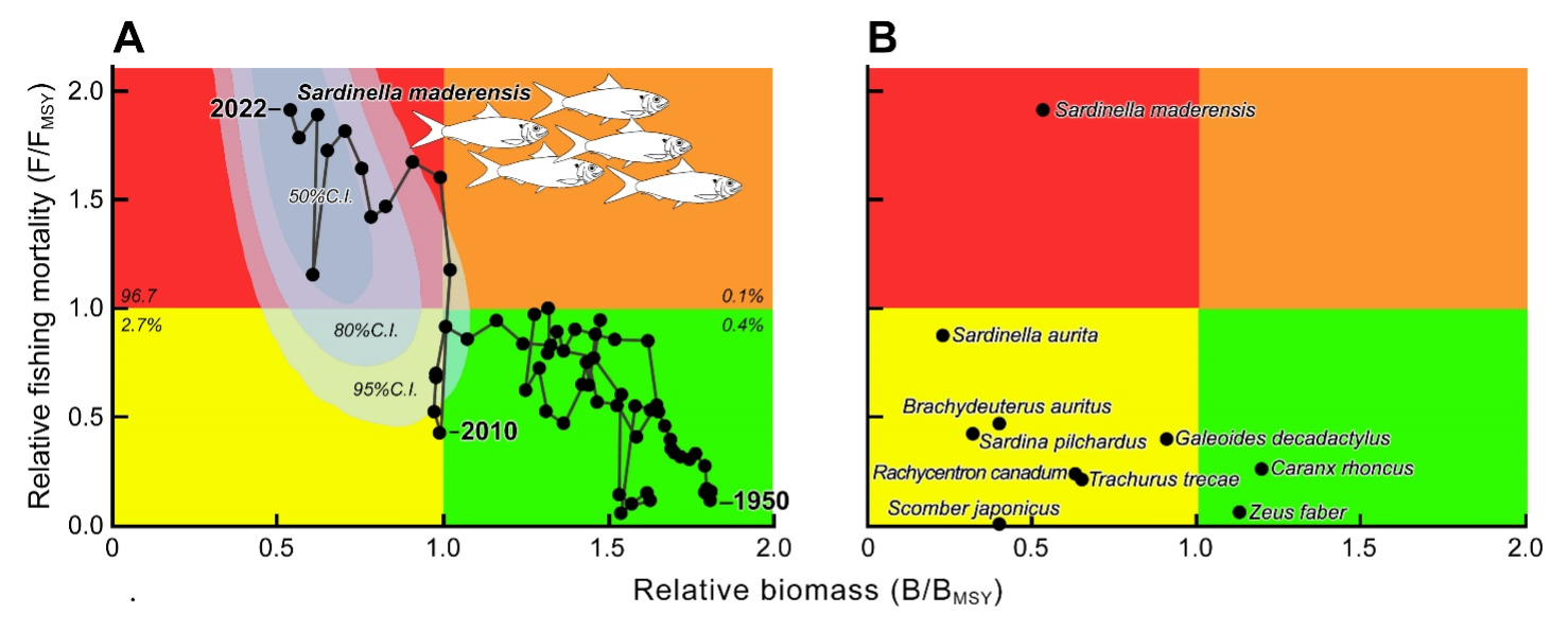 Figure 4 presents two Kobe plots: the one on the left presents the trajectory of the Madeiran sardinella (Sardinella maderensis) from underfished (in the 1950s) to overfished (from the 2010s), with the dots representing the years from 1950 to 2022; and on the right the 10 species from Figure 2, of which most have low to very low biomass, in line with results obtained for NW Africa as a whole (Christensen et al., 2004). However, there is much uncertainty about their precise position on the Kobe plots due in part to inter-annual variability. Details on the methods and priors used for these assessments can be found in Appendix Tables A1 and A2.