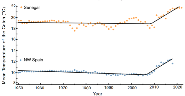 For comparison, the Mean Temperature of the Catch (MTC) was calculated for Senegal and northwest Spain using catch data reconstructed by Lopez-Ahedo (2025).