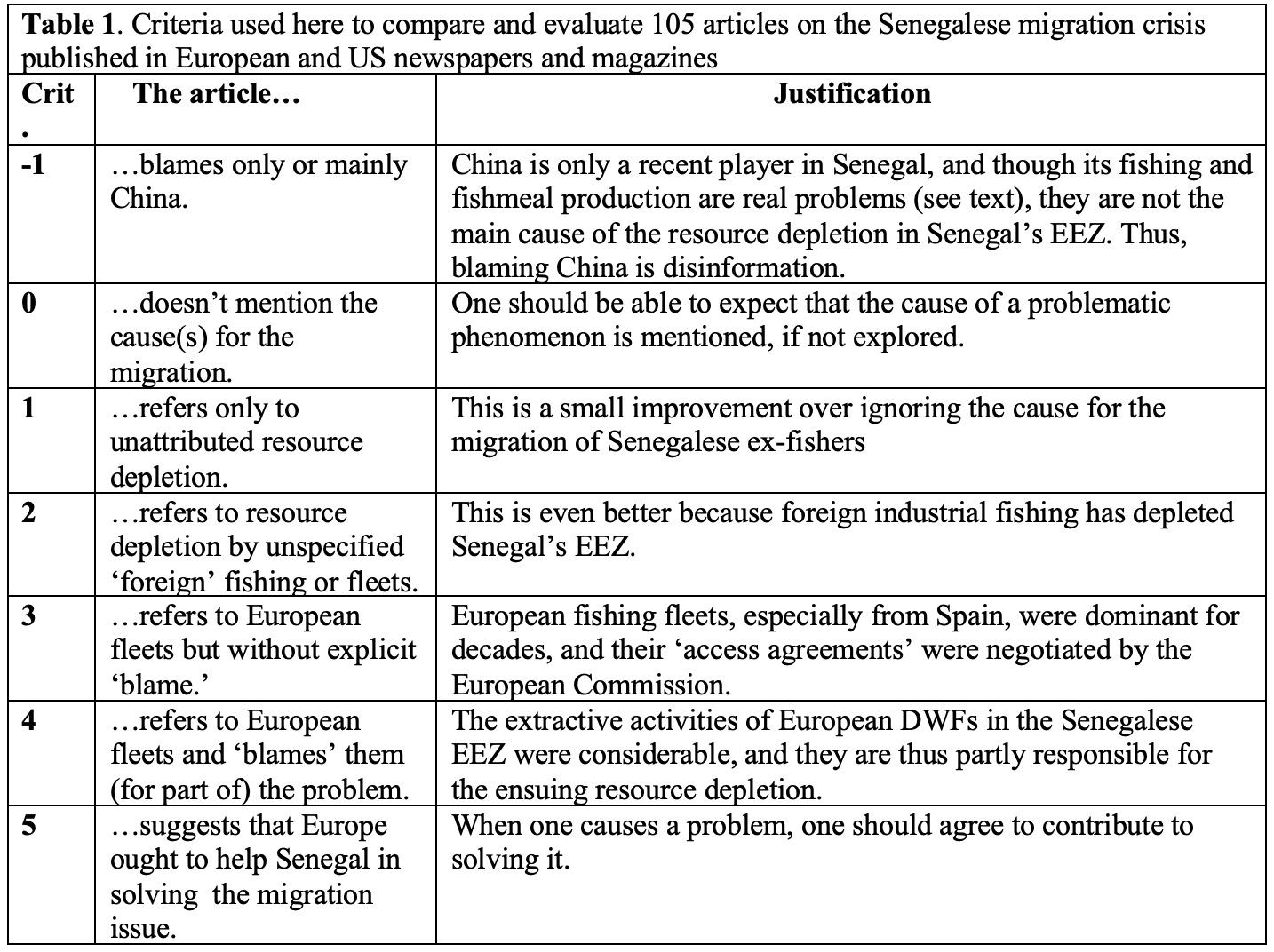 To assess the degree to which the public in the EU and allied countries is informed by the press about these issues, over 100 articles from newspapers and magazines from major countries were scored as to the insight(s) — if any — they provided into this crisis. Table 1 presents the criteria used to rank the articles, which range from 0 (no reason given for the migration) to 5 (the reason is, among others, that the EU contributes to the depletion of fish off Senegal, and this calls for reparation). A score of -1 is assigned to articles that primarily or solely blame China (see, e.g., Clover, 2020). For about a decade, the Chinese distant-water fleet has operated within Senegal’s EEZ, and newly opened Chinese-owned fishmeal plants now divert food fish away from direct human consumption. However, their presence in Senegal is relatively recent and is not the sole cause of the migration crisis; this topic is discussed further below.