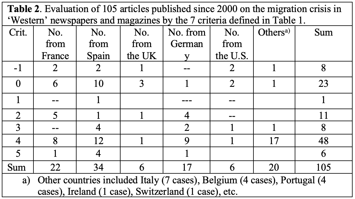 Table 2 summarizes the ‘scoring’ of newspaper and magazine articles on the Senegalese out-migration in the ‘Western’ press since 2000.