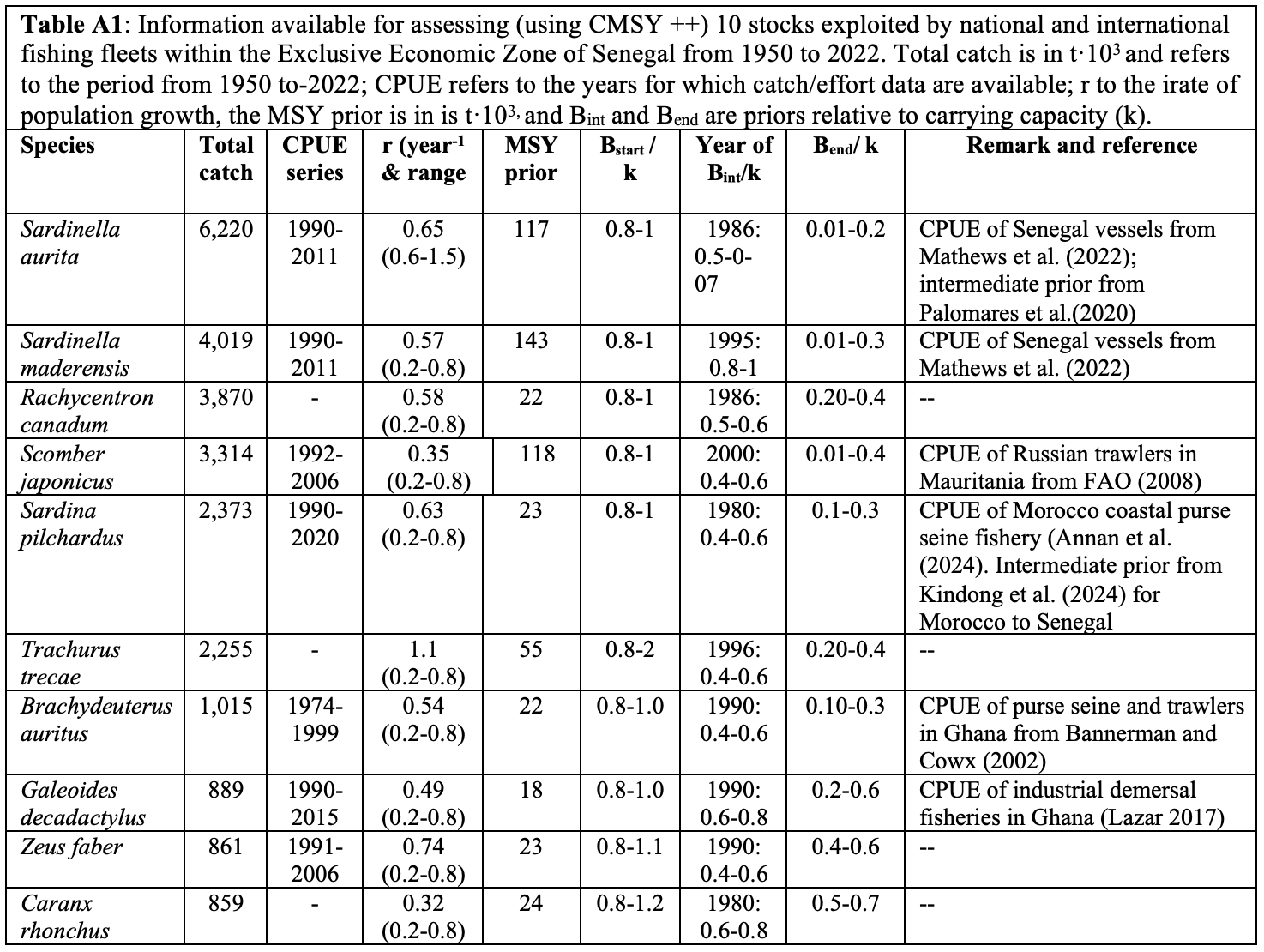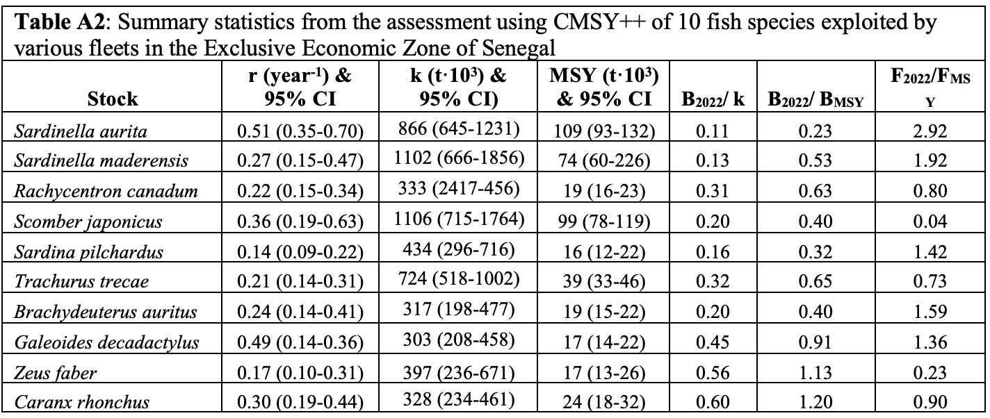 CMSY++ (Froese et al., 2023) is a method to estimate annual biomass values given a time series of catches and some supplementary information. It was applied here to the 10 most representative species in fisheries catches in Senegal, with the results shown in so-called ‘Kobe Plots,’ whose ordinate is F/FMSY and whose abscissa is B/BMSY.