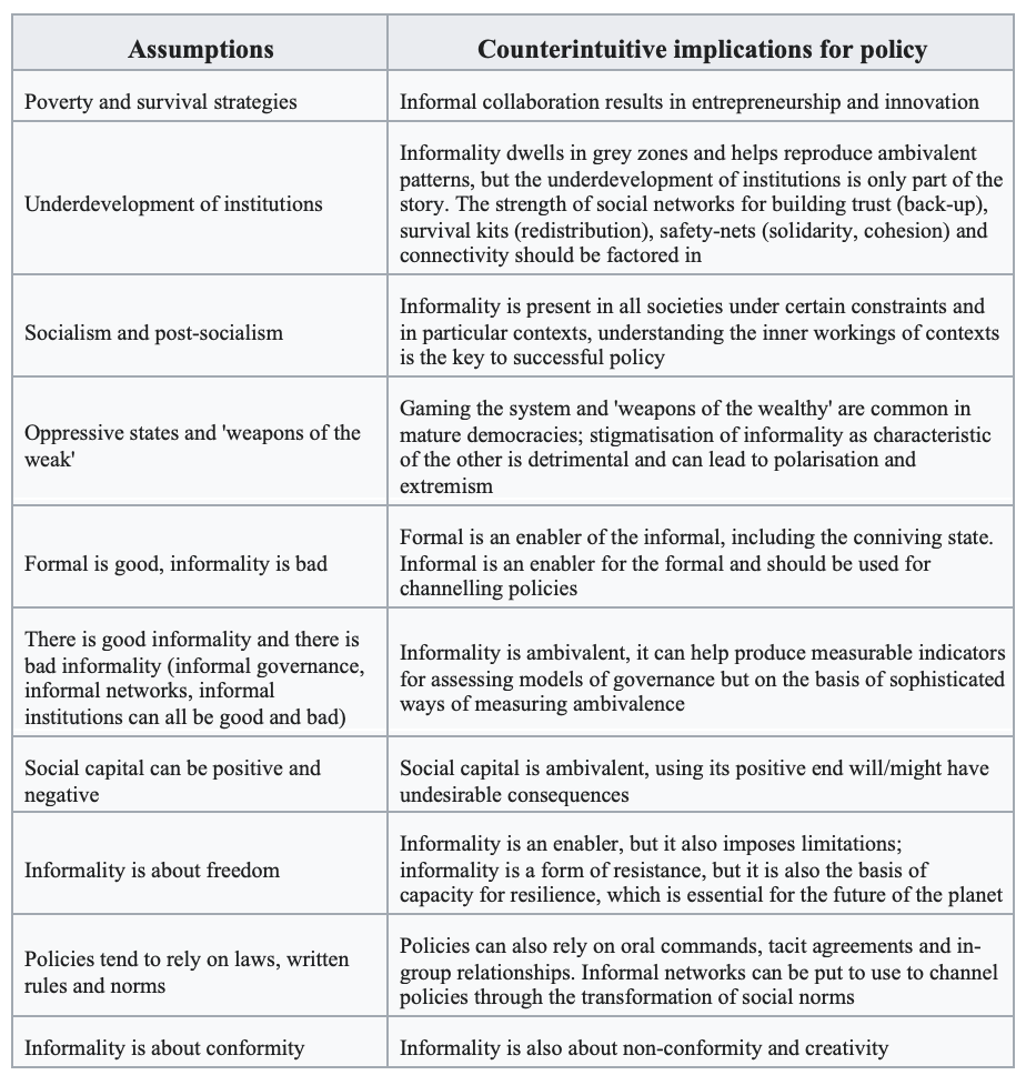 Perspectives on informality that focus on its subversive impact on the development of political or economic regimes, rather than its supportive functions, often lead to the so-called informality crusades and predict its disappearance in transition to more effective formal institutions. While it is tempting to think so, I argue that stigmatisation of informality is counterproductive in policy making and sums up the assumptions that need revision and re-framing (see Table 1).
