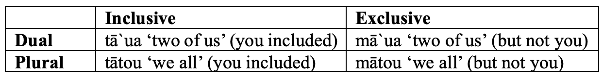 Table 1 and Table 2 below show the full forms of the first-person plural pronouns in Samoan.