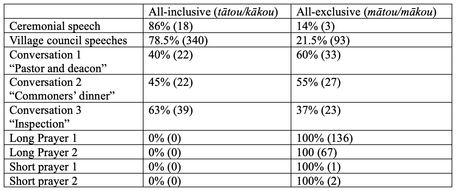 Table 3 Percentage of Samoan inclusive vs. exclusive first-person plural pronouns in a variety of speech genres across different speech events