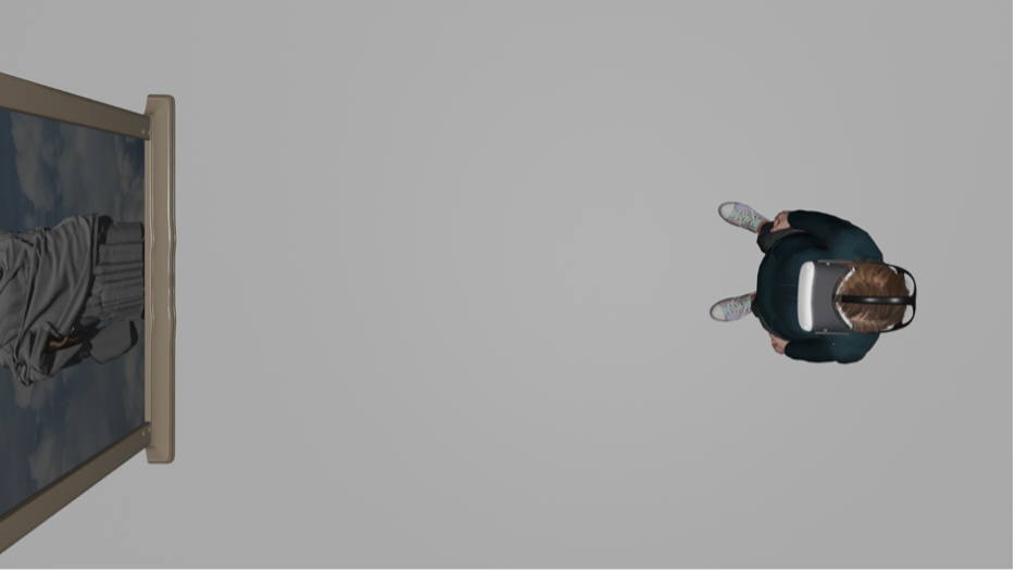 An IVR user observes their avatar's reflection as a divine entity, exemplifying the Proteus Effect–the phenomenon whereby individuals' behaviors, attitudes, and self-concept are influenced by the characteristics of their embodied virtual representation. Inspired by Frisanco et al., 2022. Created using Blender (https://www.blender.org/).