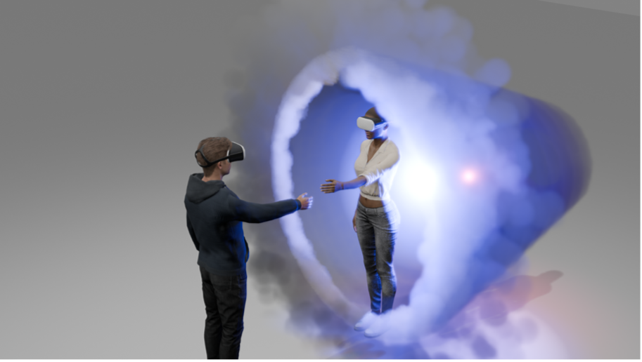 This depiction illustrates how IVR fosters embodied social presence by merging separate virtual spaces into a shared perceptual environment, enhancing place illusion. Through motion tracking and avatar embodiment, users express gestures–such as affective touch–that can support social connectedness despite physical separation. Created using Blender (https://www.blender.org/).